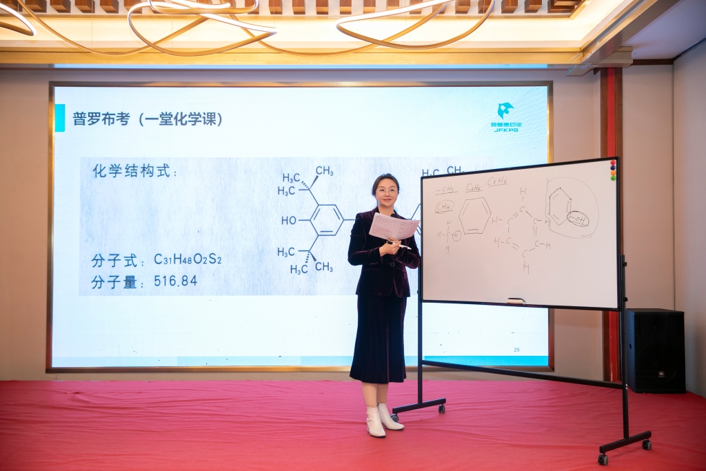 隨后總經(jīng)理王軼超通過(guò)一堂生動(dòng)的化學(xué)課,向大家講解基礎(chǔ)有機(jī)化學(xué)知識(shí),拆分普羅布考分子結(jié)構(gòu)式,增加大家對(duì)產(chǎn)品的了解。